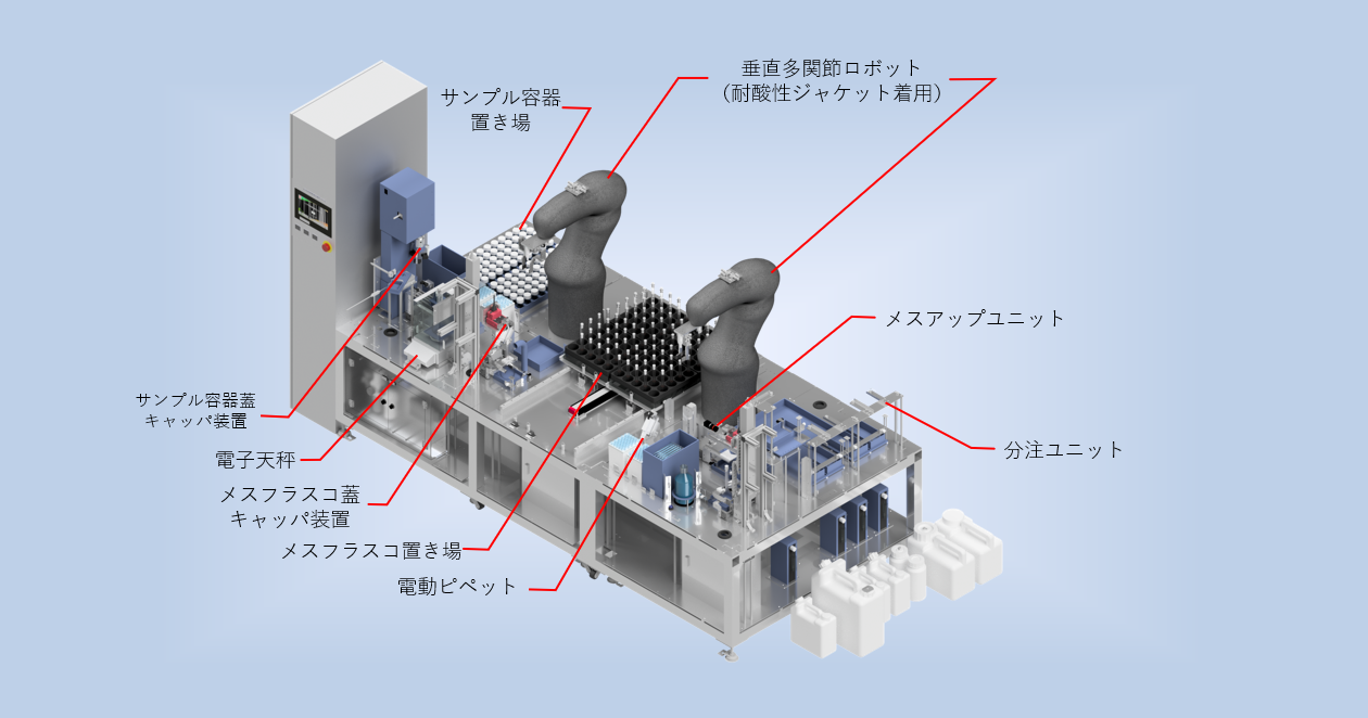 薬液調合・サンプル精製・pH管理・攪拌など、ラボでの手作業工程を全自動化する「薬液調合自動化システム」です。