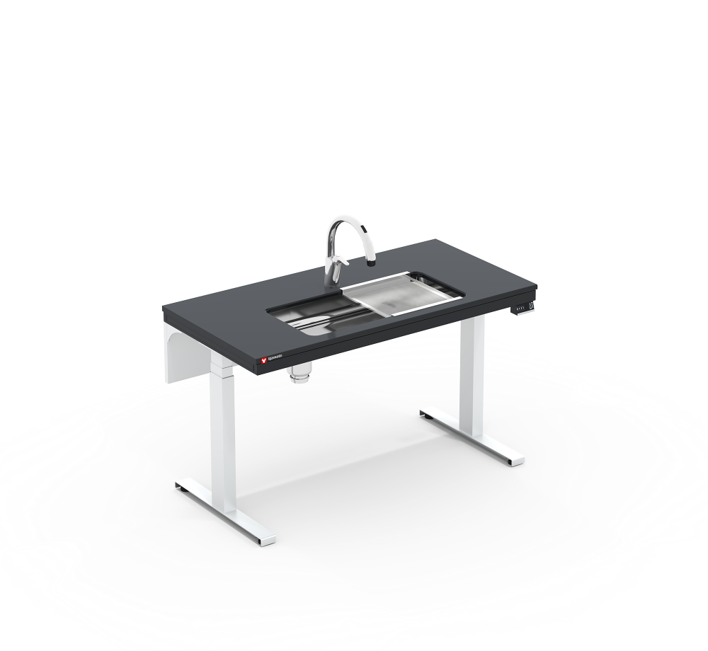 身体や作業姿勢に合わせて、手元のスイッチで天板の高さが調整可能な天板昇降式流し台