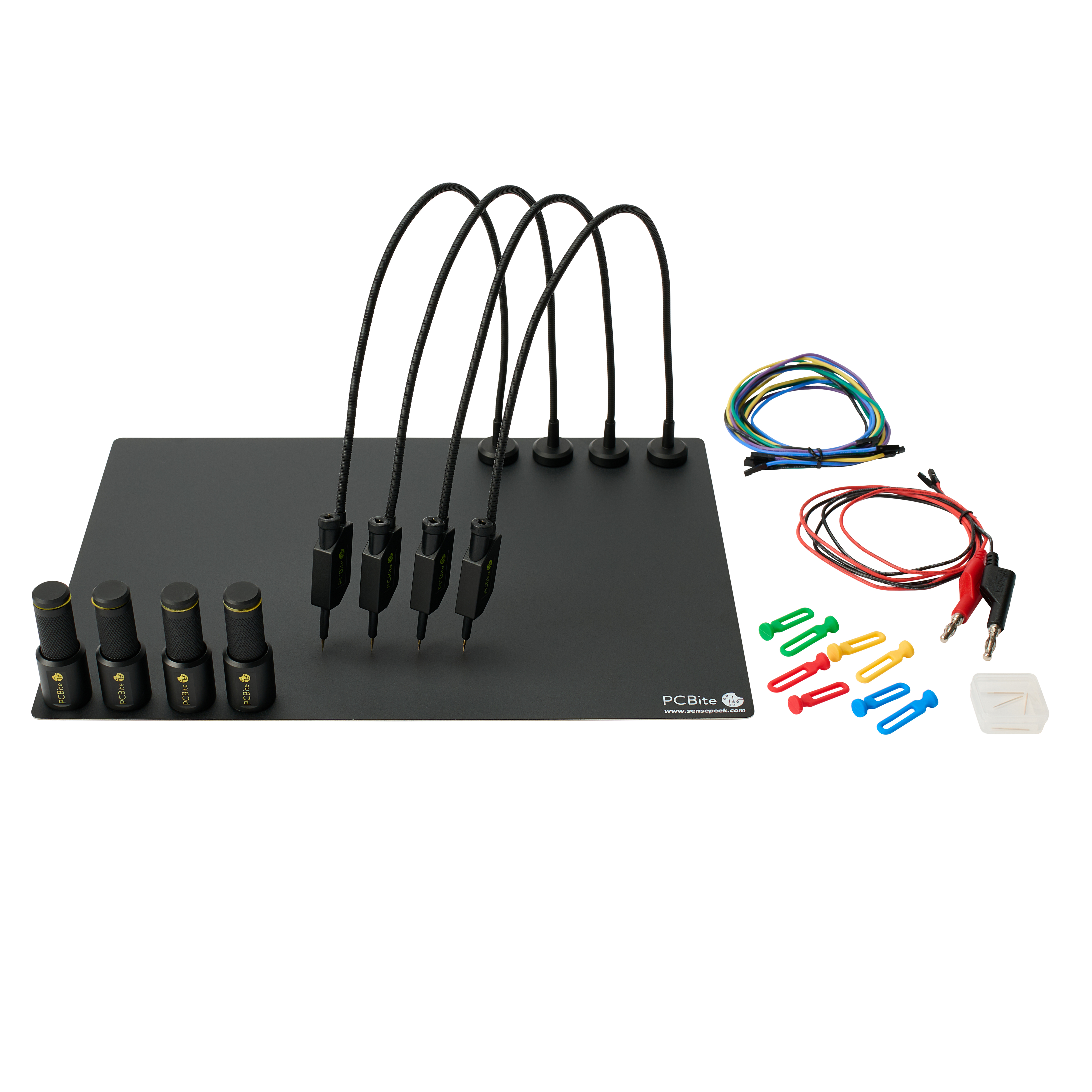 | 内容物 | 基板ホルダーx4、ベースプレート(大,A4サイズ)x1、プローブホルダー&SQ10 プローブ先端x4、ジャンパーワイヤーx5、DMM用バナナケーブル(赤/黒)各1点、プローブ針(予備)x4、ケーブルホルダー(4色)x1、絶縁ワッシャーx8(黄色)x1、マイクロファイバークロスx1 |