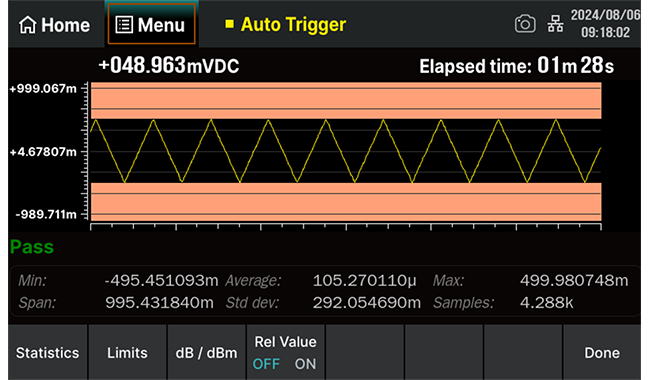 SDM4055Aは統計、制限値、dBm、dB、相対測定の5つの操作をサポートしています。 最大/最小、平均値、ピーク値、標準偏差、サンプル数を迅速に計算しながら、あらかじめ設定されたしきい値で合格/不合格テストを実現します。 電圧変換、dBベースの相対測定、偏差分析により、多機能性がさらに向上しました。