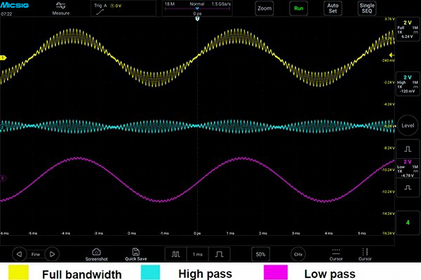 ハードウェアによるデジタルフィルタリングは、特定の周波数範囲内の信号成分を選択的に通過または遮断することができ、信号の特定の周波数帯域を分析したり、特定の周波数成分の変化を観察したりするのに非常に有用である。