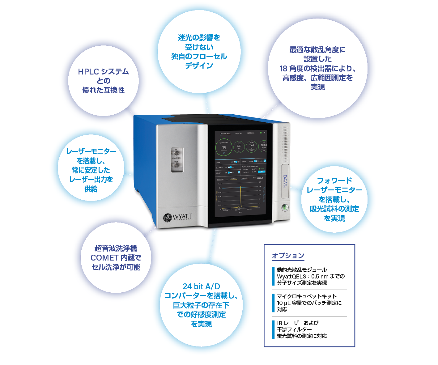 DAWNは溶液中の高分子、タンパク質、ナノ粒子の特性解析を行うための光散乱検出器で、標準物質で作成した較正曲線を用いることなく、分子量や分子サイズを高精度に測定することができます。