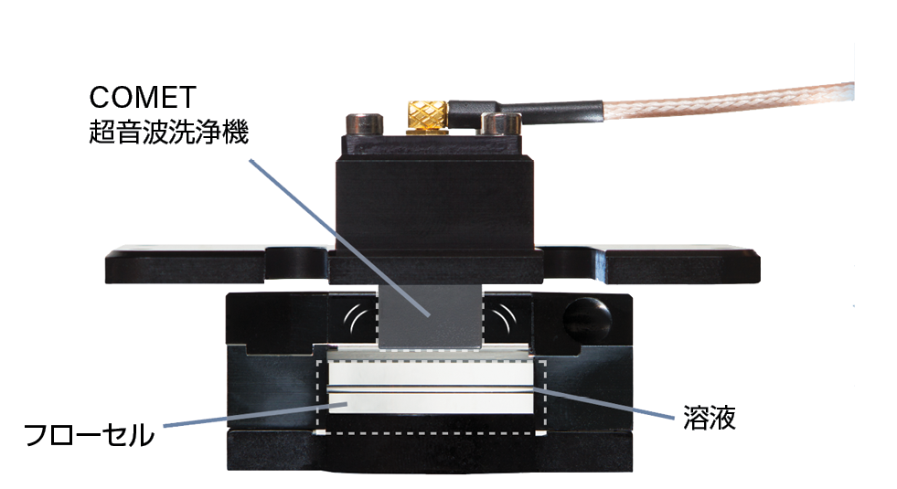 内蔵の超音波洗浄機COMETが液体を攪拌してガラス表面の粒子をほぐし、フローセル内への汚れの付着を防ぎます。