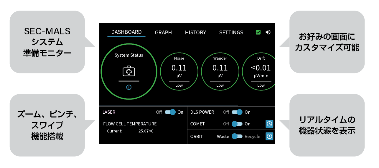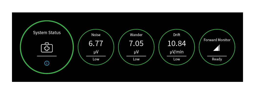 システム準備モニターで装置の平衡状態、検出器のノイズレベルをモニタリングし、測定に適した状態であるかを確認できます。問題があった場合には、システムの状態に応じて、緑・黄・赤と色が変化して警告を伝え、トラブルシューティングのためのガイダンスも提供されます。