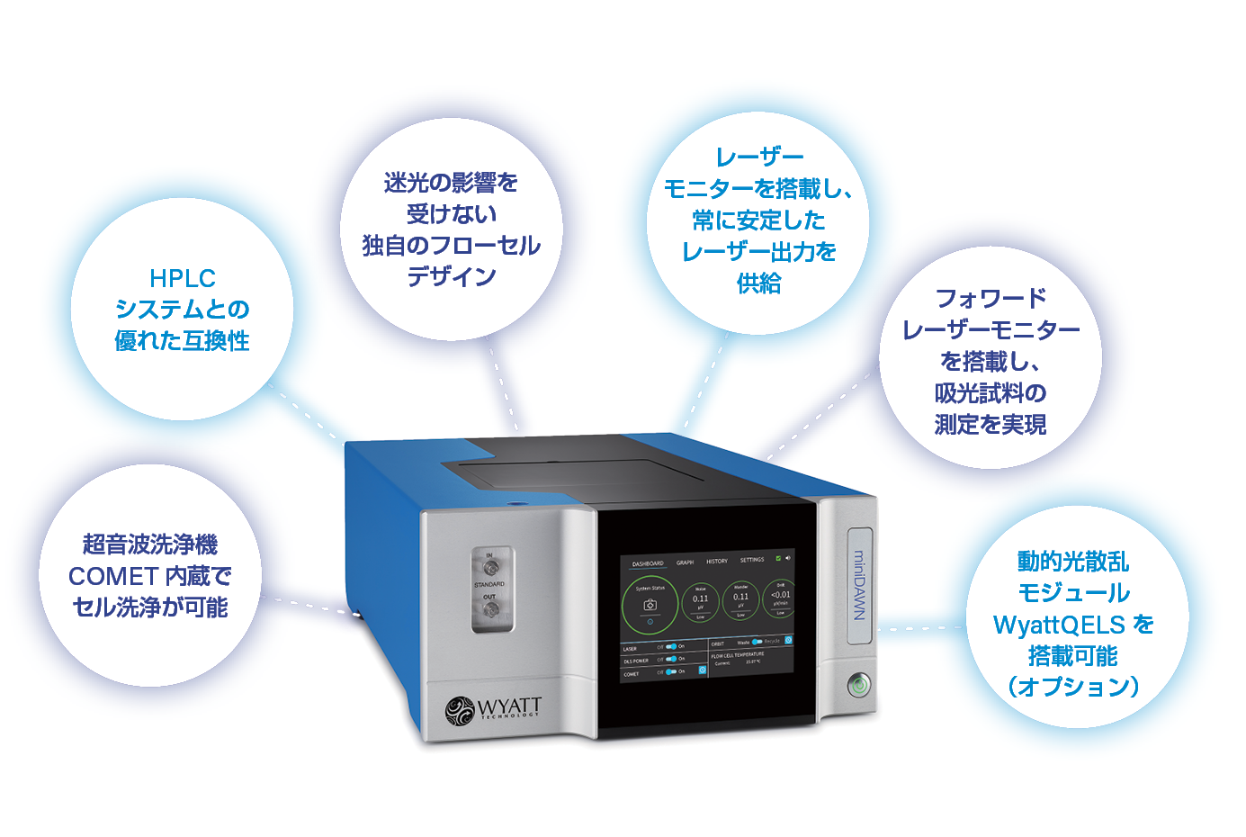 miniDAWNは溶液中のタンパク質、ペプチド、小さな高分子、ナノ粒子の特性解析を行うための光散乱検出器で、標準物質で作成した較正曲線を用いることなく、分子量や分子サイズを高精度に測定することができます。