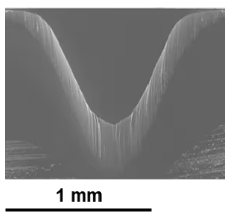 断面ミリング時のスイング角度が変わると、加工幅や加工深さが変化します。下図はSiウェハをスイング角度±15°で断面ミリングしたときの結果です。スイング角度以外は上記加工条件と同一です。上記結果と比べて加工深さが深いことがわかります。