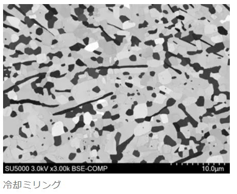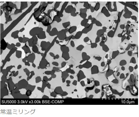 イオンビーム照射による試料の温度上昇が原因で、加工中に融解や変形する試料に有効なシステムです。過冷却による試料の割れなどを生じる試料には、冷却温度の調整機能によって、過冷却による試料の割れなどを防止することも可能です。