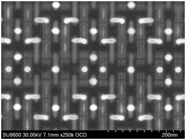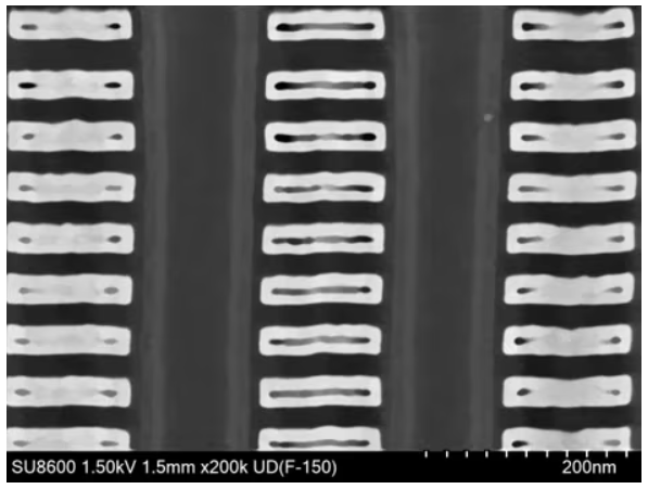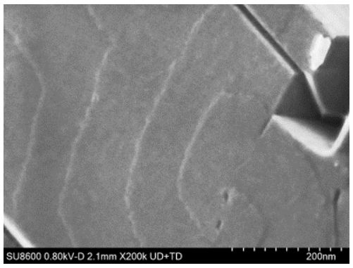 画像では3D NANDキャパシタ部の酸化膜と窒化膜の層構造を反射電子の組成コントラストで観察しています。