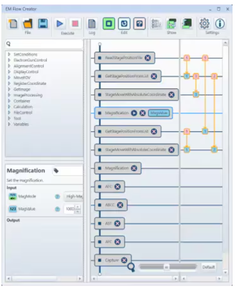 SU8600は光学系の自動調整機能を搭載しており、ユーザーの操作負荷を低減します。また、オプション機能 ”EM Flow Creator”では、連続画像取得などの操作の自動化をサポートします。倍率やステージ位置などの条件設定、フォーカス/コントラスト調整などのSEM機能をブロック化し、それらを組み合わせることで一連の観察レシピを作成します。