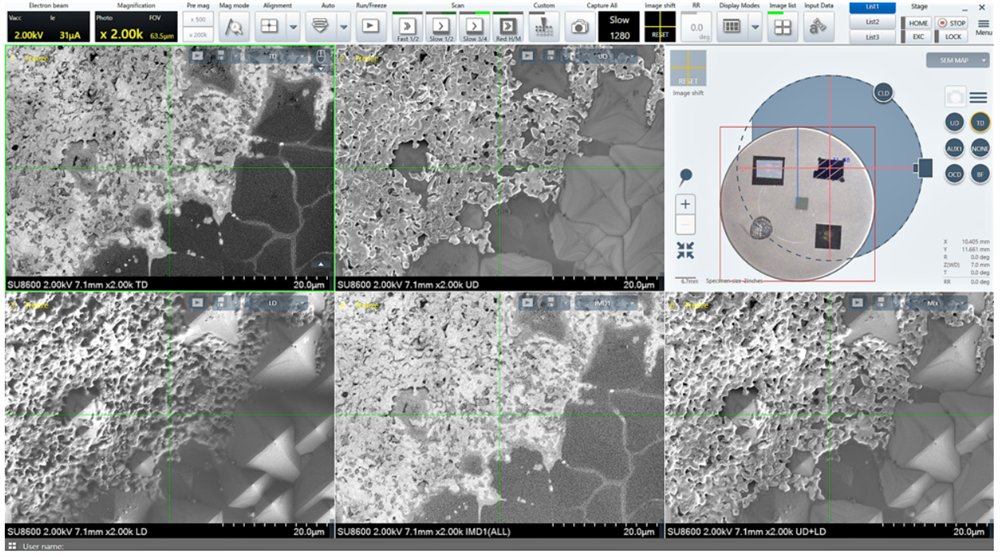 ExB光学系と検出信号制御機能により、目的に応じて二次電子/反射電子信号を分離しての画像取得が可能です。