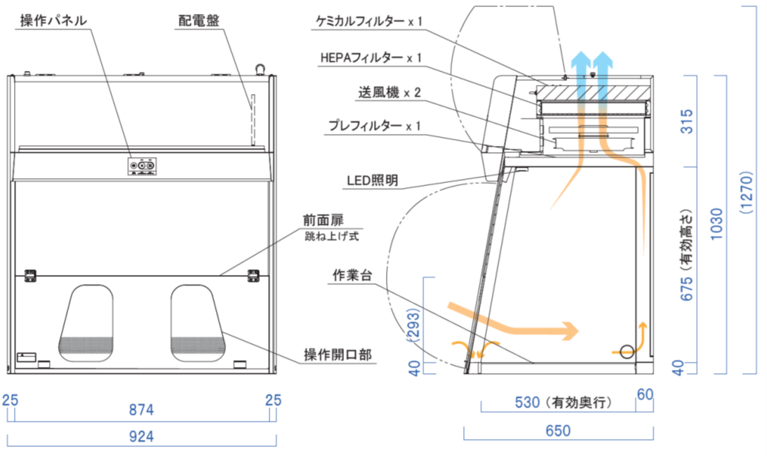 | 構造 | 本体:鋼板製焼付塗装、前面パネル:アクリル樹脂、 側面パネル:PET樹脂、作業台:トレスパ天板 |