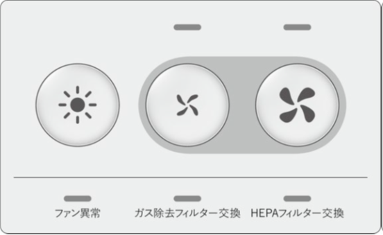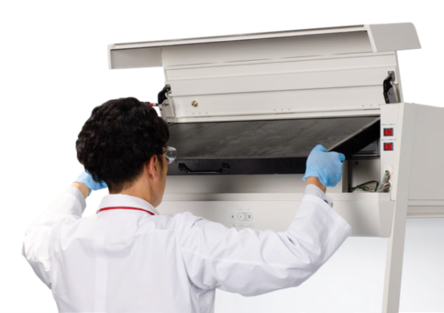 メンテナンスカバーを跳ね上げる事で正面からフィルター(ガス除去、HEPA、プレ)の交換が可能です。