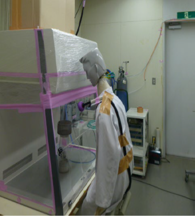 フードの前にマネキンを立たせ鼻孔部を測定基準として庫内からのガスの漏れ量を測定。