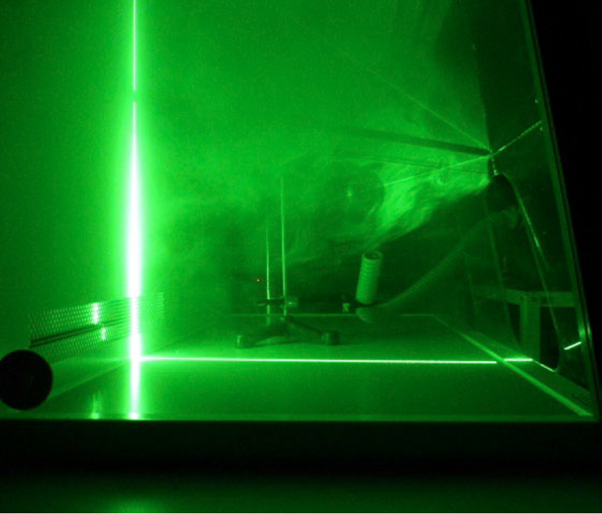 スモークを使用して実際の気流を可視化する方法を取り入れ、製品の安全を確認しています。