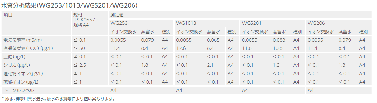 水質は蒸留水、イオン交換水どちらも水質A4レベルとなります。
