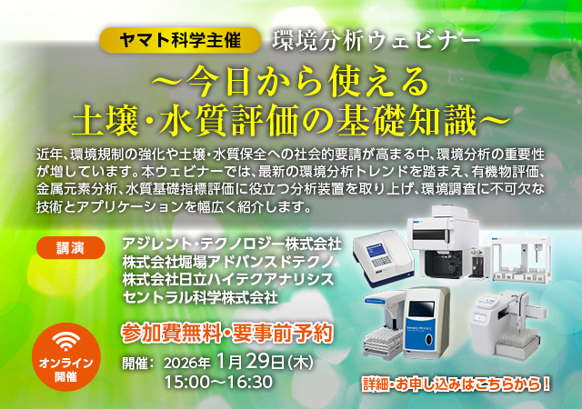 本ウェビナーでは、最新の環境分析のトレンドを踏まえ、有機物評価や金属元素分析に加え、水質の基礎指標評価に役立つ分析装置まで幅広く取り上げ、環境調査に不可欠な技術とアプリケーションをご紹介いたします。